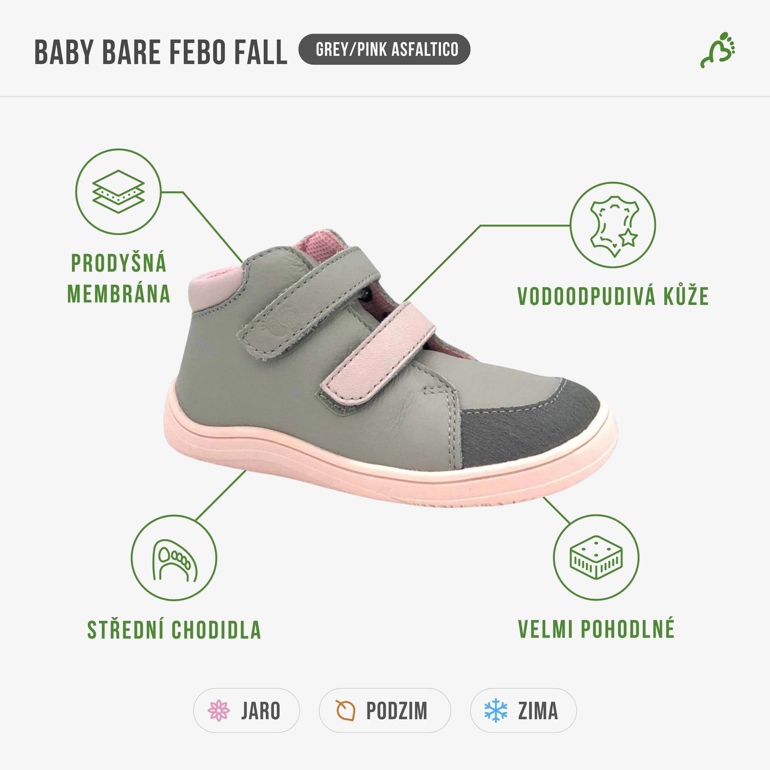 Baby Bare Febo Fall jsou ideální volbou pro děti se středním až širším chodidlem. Hodí se i na dominantní palec, či nožičku do tvaru ploutvičky. Výborně sedí také na nižší až střední nárt. A díky zapínání na suchý zip pevně drží i na úzkém kotníku.