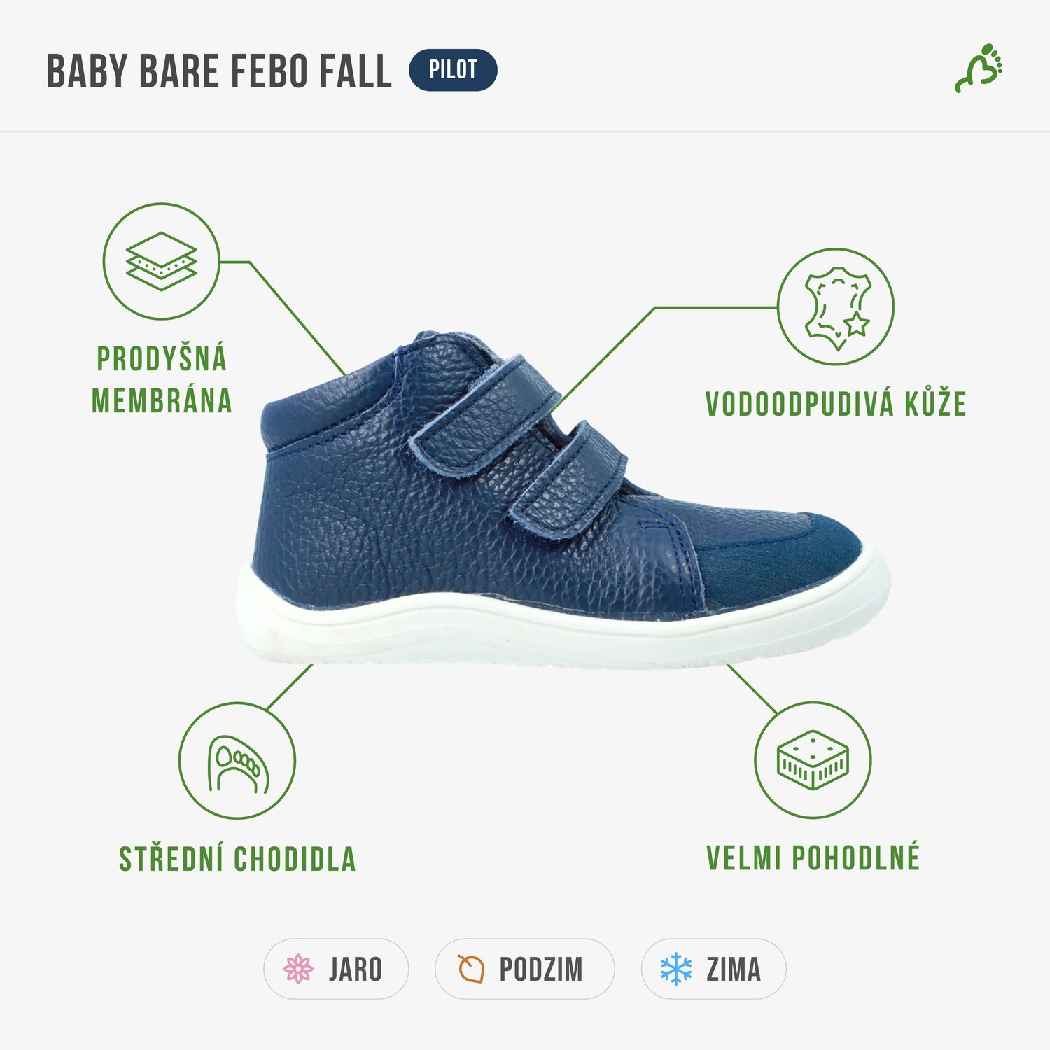 Baby Bare Febo Fall jsou ideální volbou pro děti s normálním až širším chodidlem. Hodí se i na dominantní palec, či nožičku do tvaru ploutvičky. Výborně sedí také na nižší až střední nárt. A díky zapínání na suchý zip pevně drží i na úzkém kotníku.