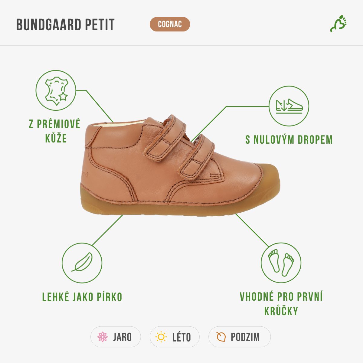 Ikonická dětská barefoot bota BUNDGAARD Petit pro první krůčky – široká špička, pevný opatek a flexibilní podrážka bez dropu pro zdravý vývoj nohou.
