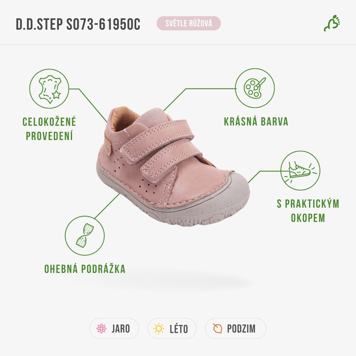Měkká a velmi ohebná podrážka umožňuje přirozený pohyb chodidla a podporuje zdravý vývoj dětských nožek. Prostorná špička poskytuje dostatek místa pro prsty a respektuje i dominantní palec. Praktické zapínání na dva suché zipy usnadňuje obouvání a dobře přizpůsobí botu různým typům nártu.