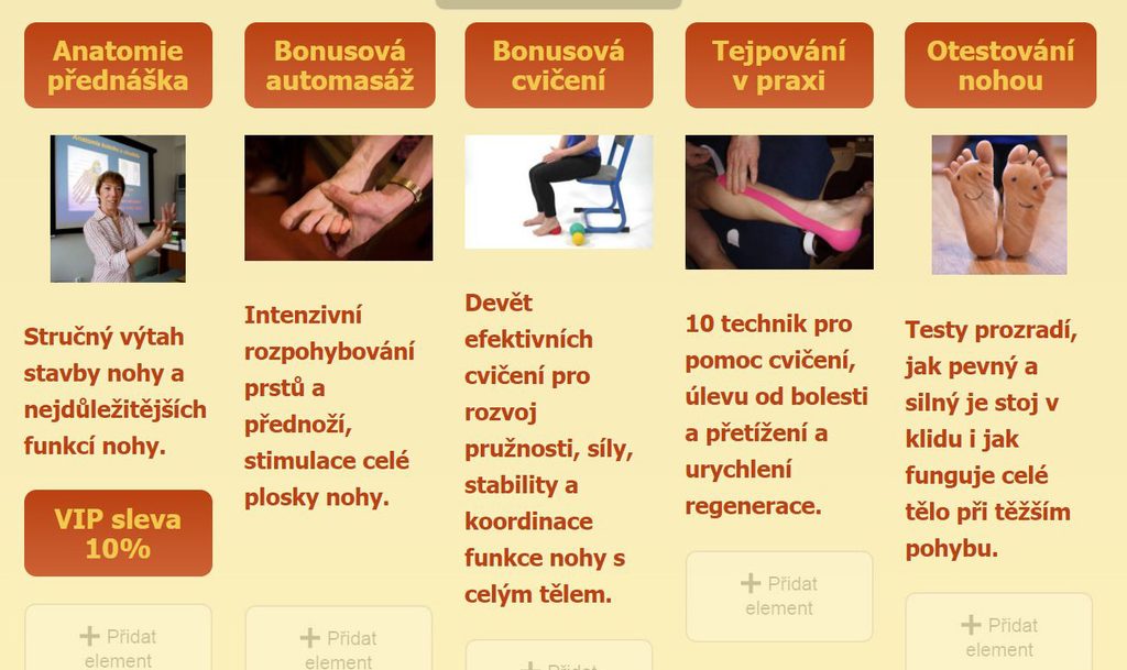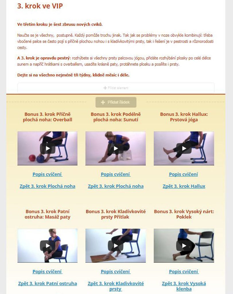 | „Díky pestrému obsahu VIP kurzu a pravidelnému cvičení je výsledek už vidět. Zlepšila se mi příčná klenba a uvolnil bolavý hallux. Vbočený palec si teď umím zatejpovat i sama.“ (Milada Ledvinová) | |