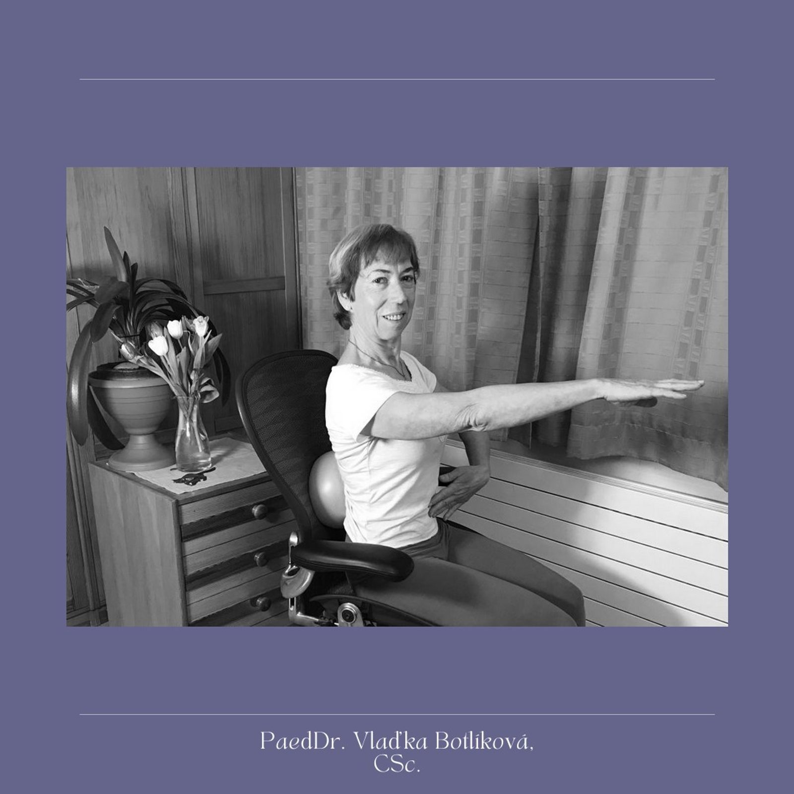 | Vysokoškolská učitelka a lektorka zdravotního cvičení pro soukromé firmy i státní organizace. Již 30 let předává lidem umění sebeléčby pohybem. Posledních deset let se soustřeďuje na problematiku nohou a učí své klienty, jak se zbavit bolestí a opět si užívat zdravé tělo a lehký krok. |