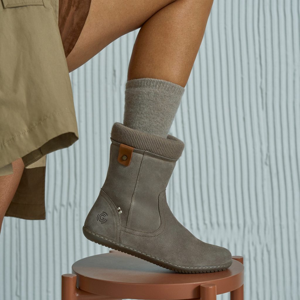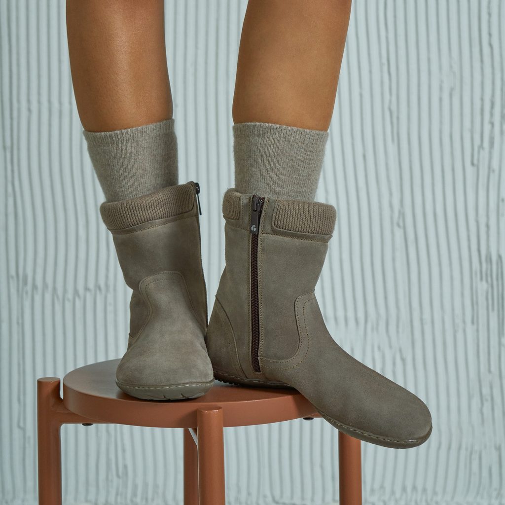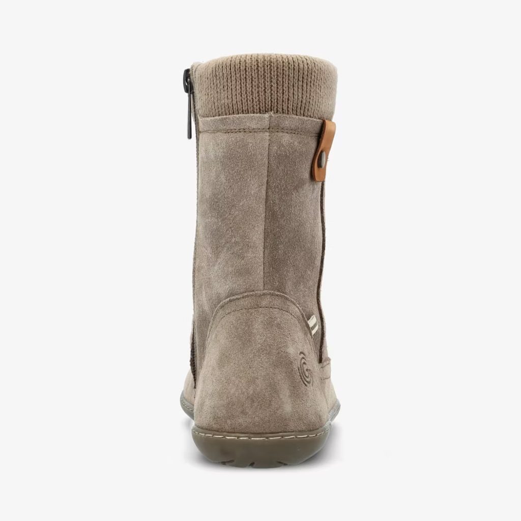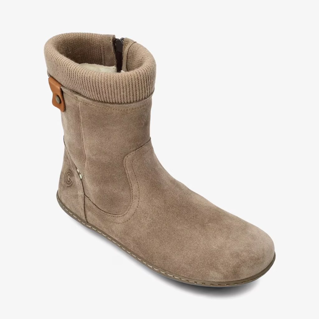 Groundies Iceland je symbolem zimního komfortu a přirozené volnosti. Tento stylový barefootový zimní model spojuje pocit chůze naboso s dokonalým teplem díky hřejivé vlněné podšívce a měkkému semišovému svršku.