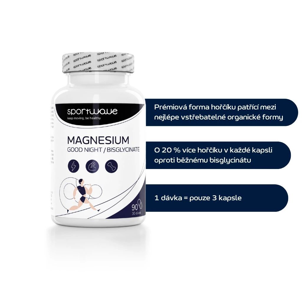 SportWave Magnesium Good Night je vysoce vstřebatelný hořčík ve formě bisglycinátu, který podporuje kvalitní spánek, uvolnění svalů a regeneraci organismu. Díky šetrné formě je vhodný i pro citlivé trávení a ideální jako součást večerní rutiny.