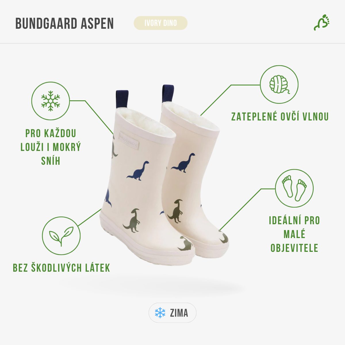 Aspen je zimní verze ikonických holínek Charly od značky Bundgaard, které jsou stálicí v jejich kolekci již po generace. Vyrobeny jsou z měkké přírodní gumy a uvnitř zateplené hřejivou vlněnou podšívkou, která spolu s vyjímatelnou vlněnou stélkou zajistí teplo i sucho během chladných a deštivých zimních dnů.