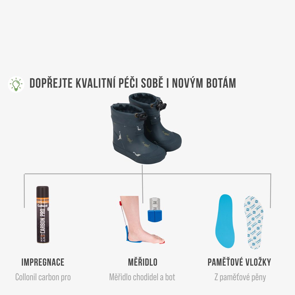 Změřte velikost nohy. Aby holínka z nohy nesjížděla, doporučujeme v tomto případě nadměrek maximálně 1 cm (u menších dětí klidně i o kousek méně).