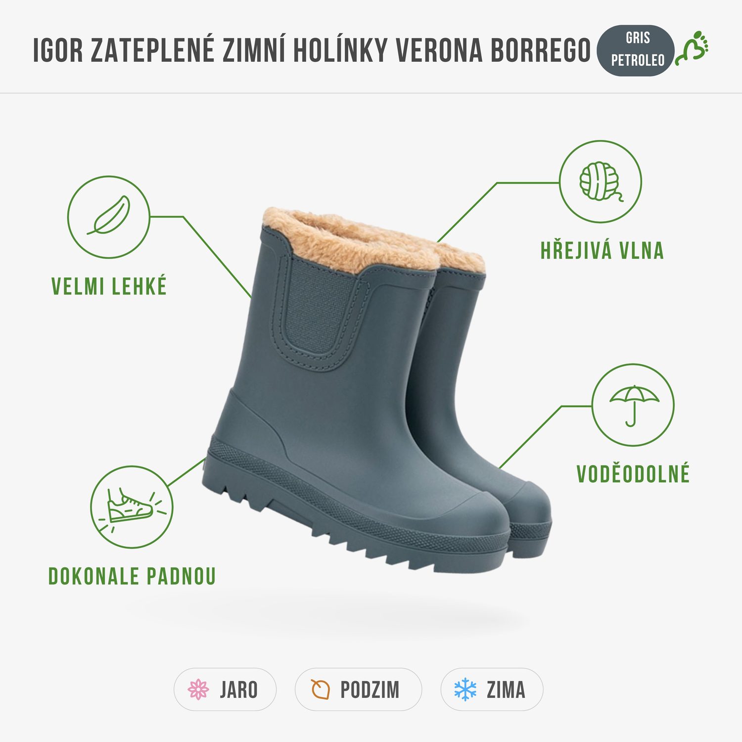 Stylové španělské holínky IGOR zateplené příjemným beránkem zajistí tepelný komfort každé rozdováděné nožičky. Je zdravé trávit čas venku a v přírodě za každého počasí. Tyto holínky jsou ideální do lesní školy, na zahradu, ale klidně i do města od podzimu do jara.