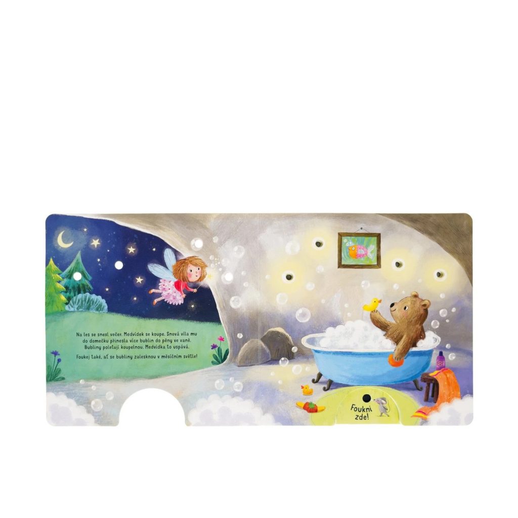 Pro zvířátka je čas jít spát. Ale než se zavřou všechna očka, přiletí snová víla. Přifoukne Medvídkovi pěnu do koupele a hvězdný prach pro malé Jezevce. A měsíček? Snová víla mu svým fouknutím rozsvítí kamarádky na obloze - hvězdičky! Foukni na knížku a nechej také rozzářit světélka!