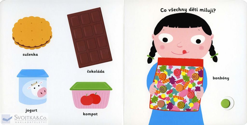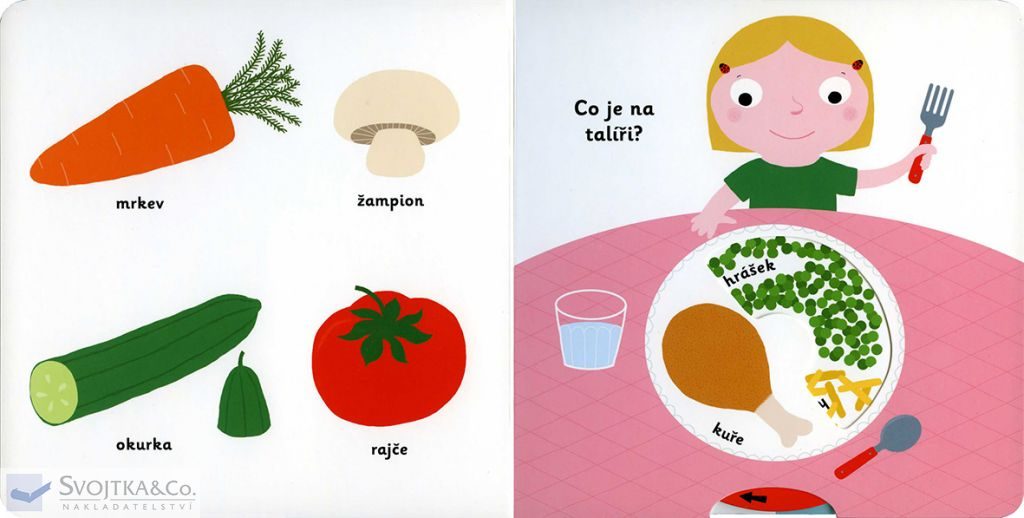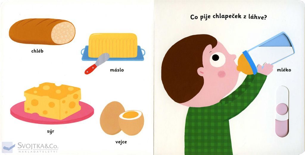 Jak vypadá jablíčko, když se rozkrojí? Co bude dnes k obědu? A co se maže na chleba ke snídani? Je zdravější hrášek, nebo hranolky? Které ovoce je oranžové? Rozdělí se mlsná holčička o bonbony? Stačí jen vložit prstík do správného otvoru a lehce vysunout, zatáhnout nebo otočit ve směru šipky a hned bude váš malý objevitel či objevitelka znát odpovědi na všechny tyto otázky o jídle. Leporelo je určeno pro nejmenší děti od jednoho roku a má pevné stránky s posuvnými a otočnými prvky, a tak si naši nejmenší mohou při prohlížení a rozeznávání jídel a pokrmů procvičit i jemnou motoriku.