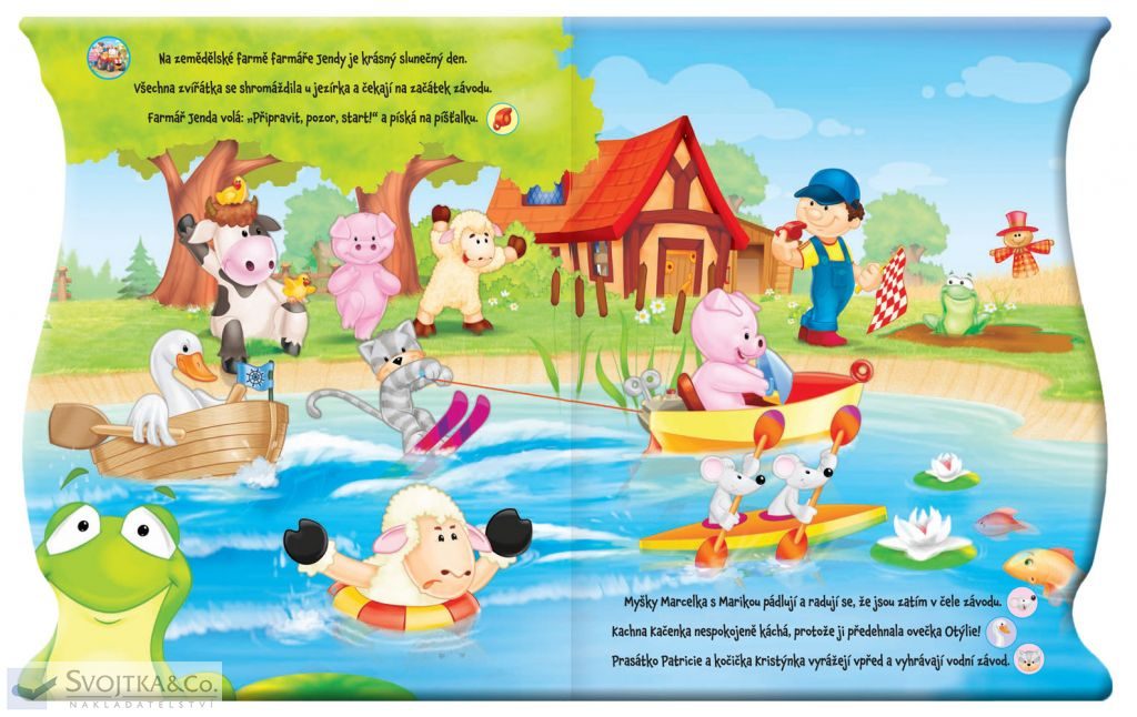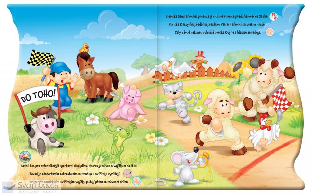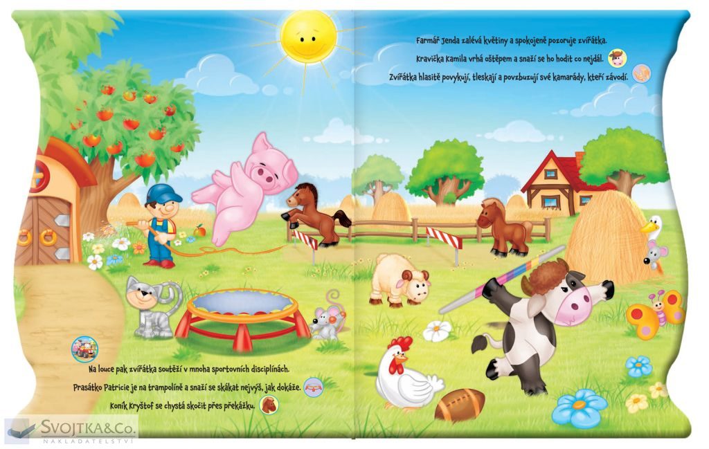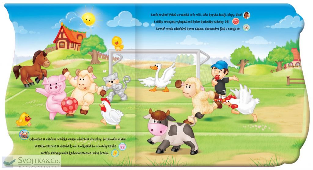 Na farmě je krásný slunečný den. Zvířátka jsou připravena na startu dnes se totiž konají závody na místním jezírku... Pak zvířátka soutěží v mnoha dalších sportovních disciplínách na louce prasátko Patricie skáče na trampolíně, koník Kryštof skáče přes překážku, Kravička Kamila vrhá oštěpem… Všechna zvířátka pak závodí v běhu s vajíčkem na lžíci a sportovní den je zakončen fotbalovým utkáním. Tato knížka s veselými celostránkovými ilustracemi obsahuje krátké vyprávění plné zvířátek i sportovních výkonů a hlavně 18 zvuků, které skvěle doplňují děj příběhu. Vaše děti si zamilují čtení veselého příběhu společně s mačkáním tlačítek! Stačí jen najít odpovídající obrázek, stisknout a rázem se přenesete na farmu plnou zvuků! Kniha obsahuje tři výměnné baterie.