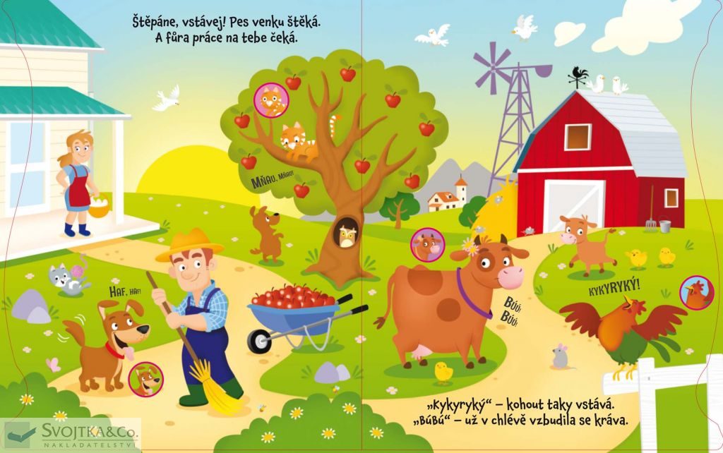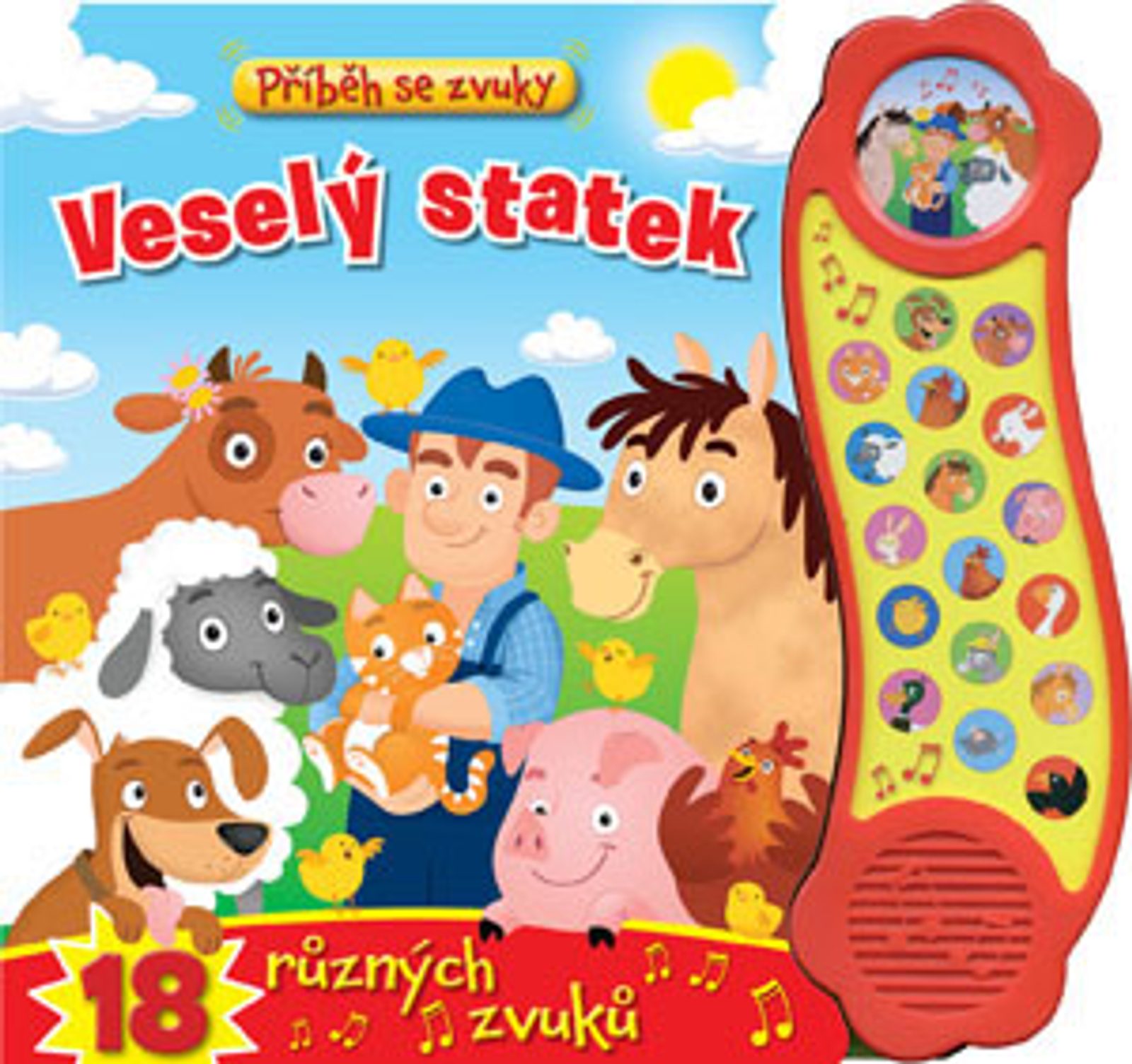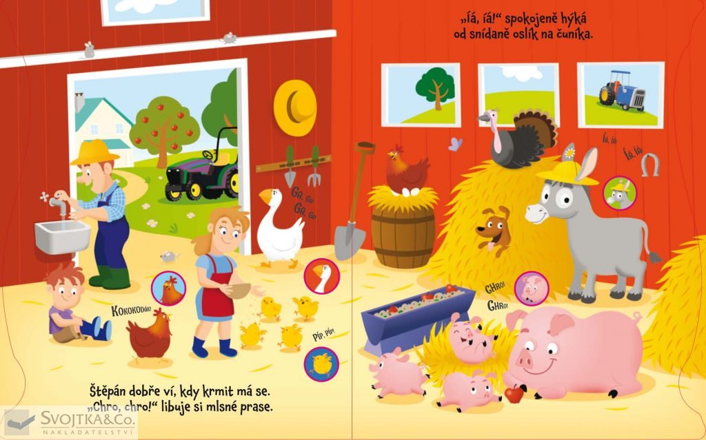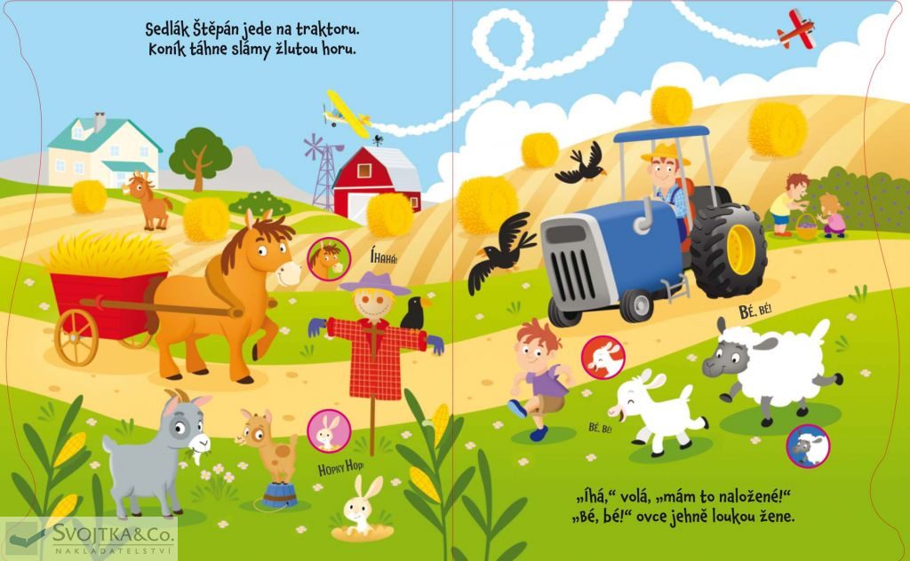 Veselá knížka s celostránkovými ilustracemi a krátkým veršovaným vyprávěním o farmáři a jeho zvířátkách, která je doplněna 18 tlačítky se zvuky ze statku.