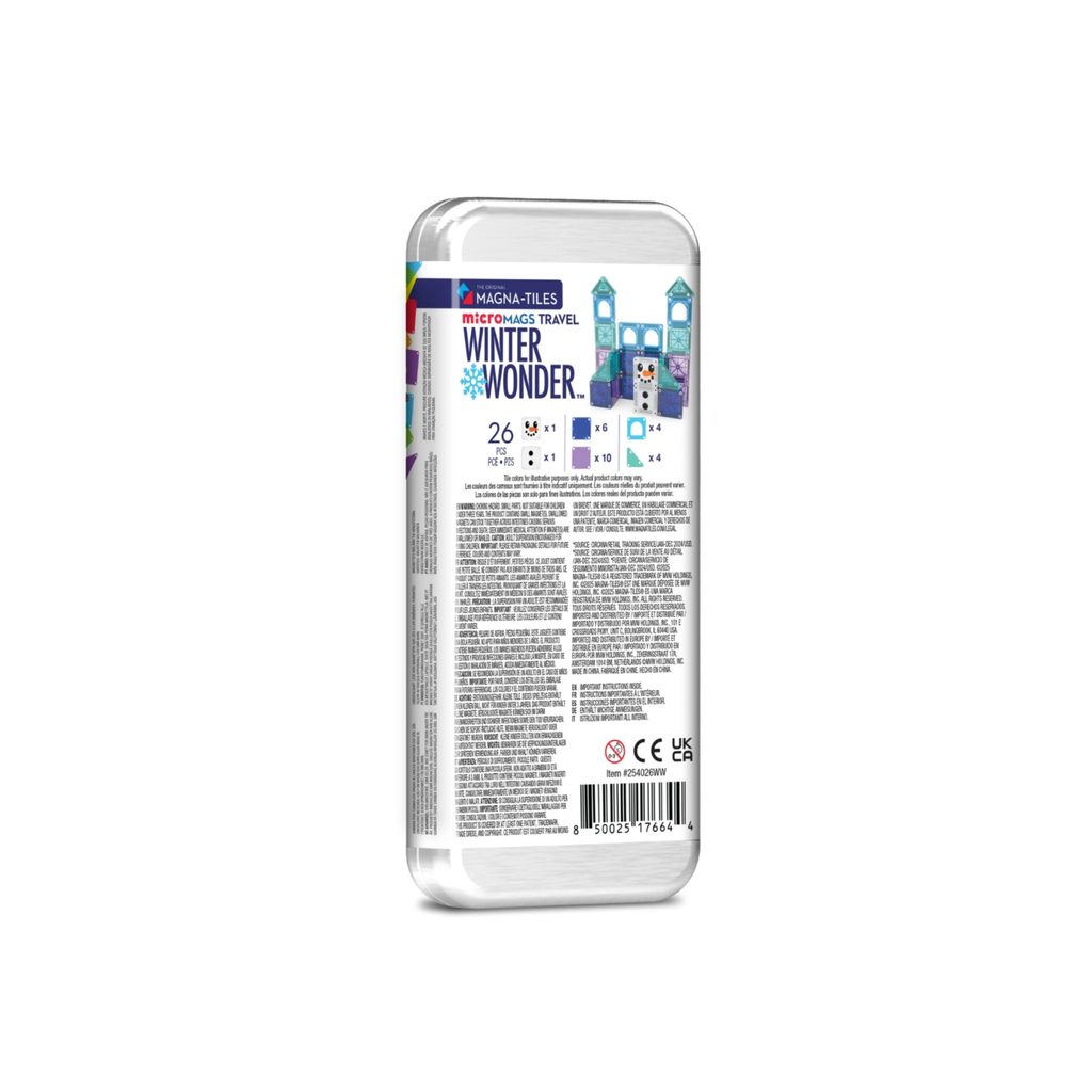 Magnetická stavebnice microMAGS Travel Set je ideální společník na cesty. Obsahuje praktičnost a zábavu v jednom kompaktním balení. Zimní tématika přinese dětem do magnetické hry záplavu zábavy a mrazivé magie! Díky svěžím zimním barvám, které se třpytí jako sněhové vločky, tato sada umožňuje mladým stavitelům vytvářet ledové hrady, postavičky a zasněžené scény.