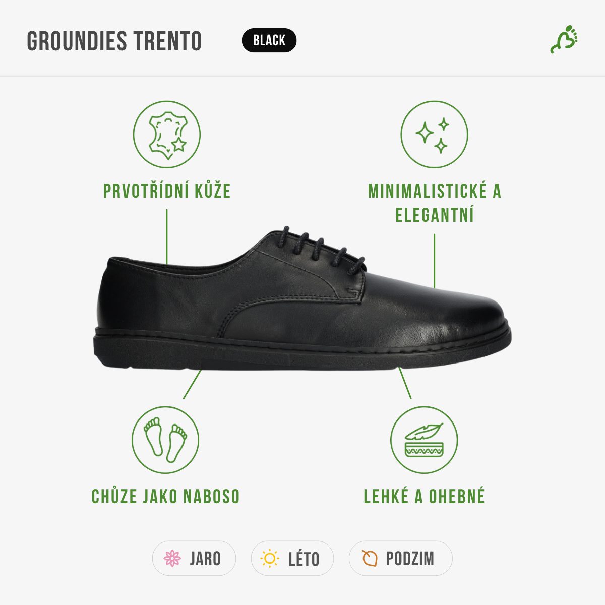 Model Groundies Trento je klasická šněrovací polobotka, která spojuje elegantní minimalismus s maximálním pohodlím. Díky flexibilní podrážce a anatomickému střihu poskytuje volnost pohybu a prostor pro prsty.