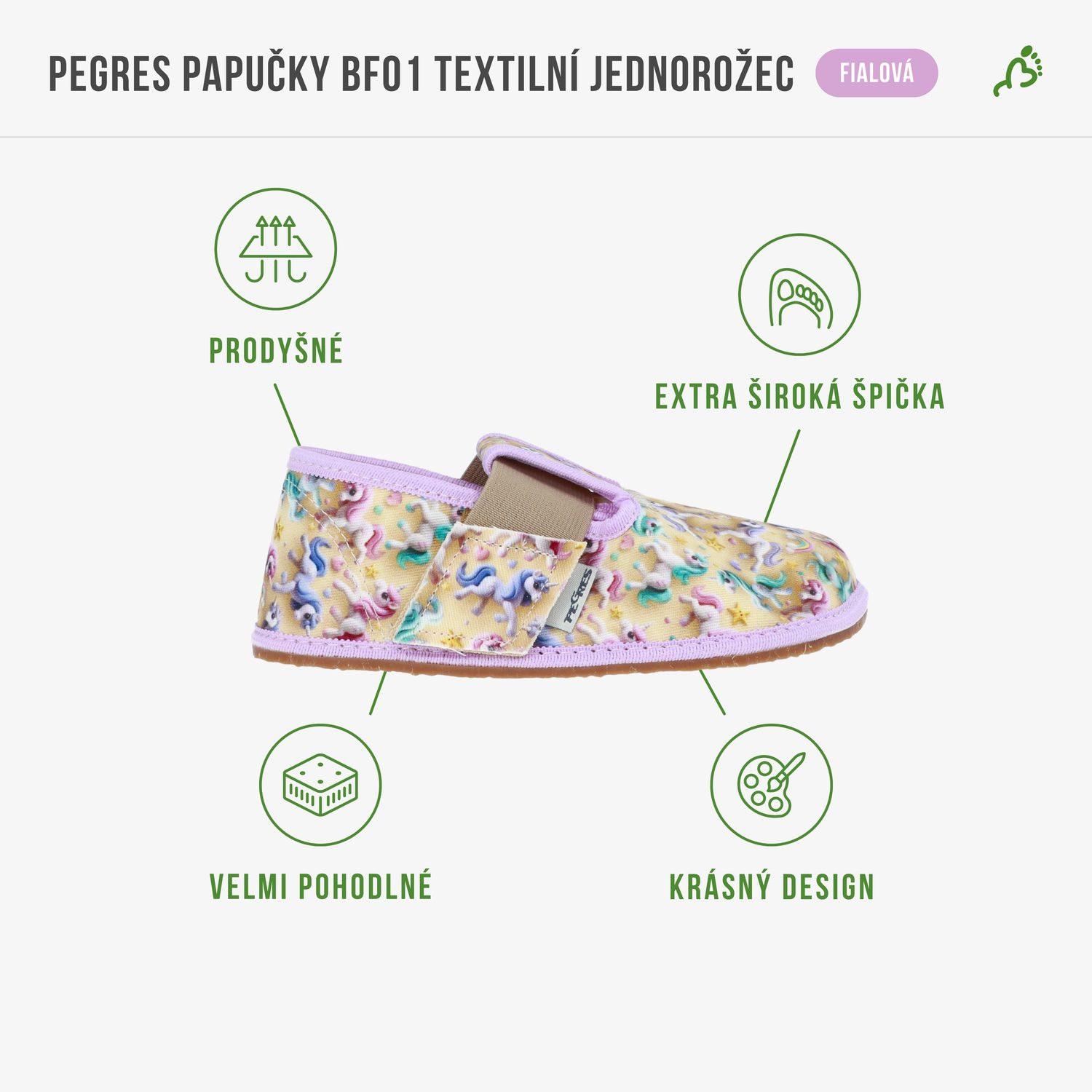 Bačkůrky jsou vyrobeny z kvalitní bavlněné textilie, která je prodyšná, měkká a příjemná na dotek, takže se dětská noha nepotí ani při celodenním nošení doma nebo ve školce. Zapínání na suchý zip umožňuje snadné a rychlé obouvání i těm nejmenším dětem a zároveň dobře drží bačkůrku na noze.