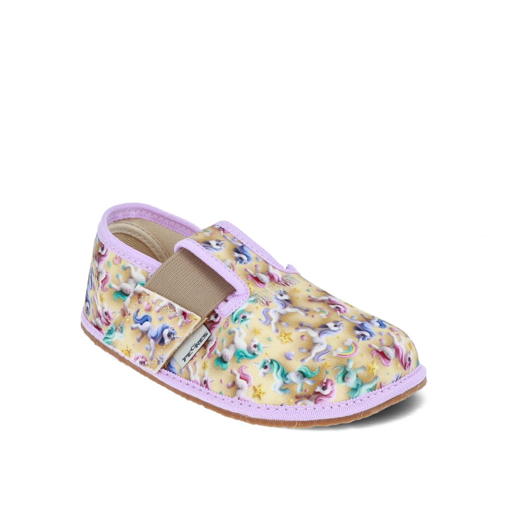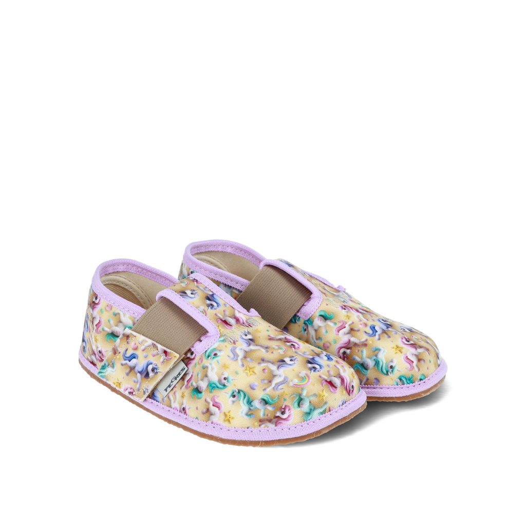 Bačkůrky jsou vyrobeny z kvalitní bavlněné textilie, která je prodyšná, měkká a příjemná na dotek, takže se dětská noha nepotí ani při celodenním nošení doma nebo ve školce. Zapínání na suchý zip umožňuje snadné a rychlé obouvání i těm nejmenším dětem a zároveň dobře drží bačkůrku na noze.