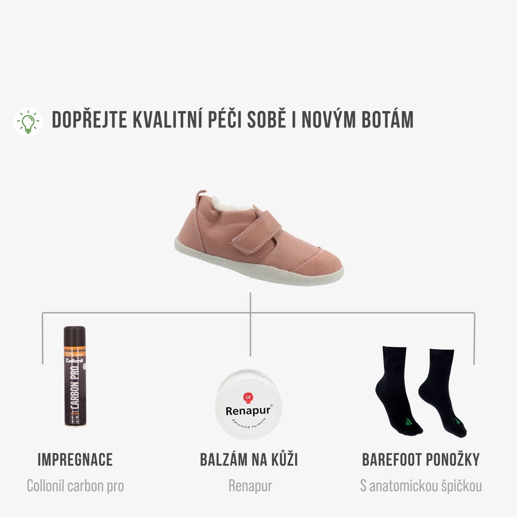 Tyto nízké kožené zimní boty zateplené merino vlnou vás na první pohled zaujmou minimalistickým designem. Jsou lehké a velice flexibilní, tudíž se hodí pro první krůčky. Díky nařasení okolo kotníku a zapínání na suchý zip skvěle padnou.