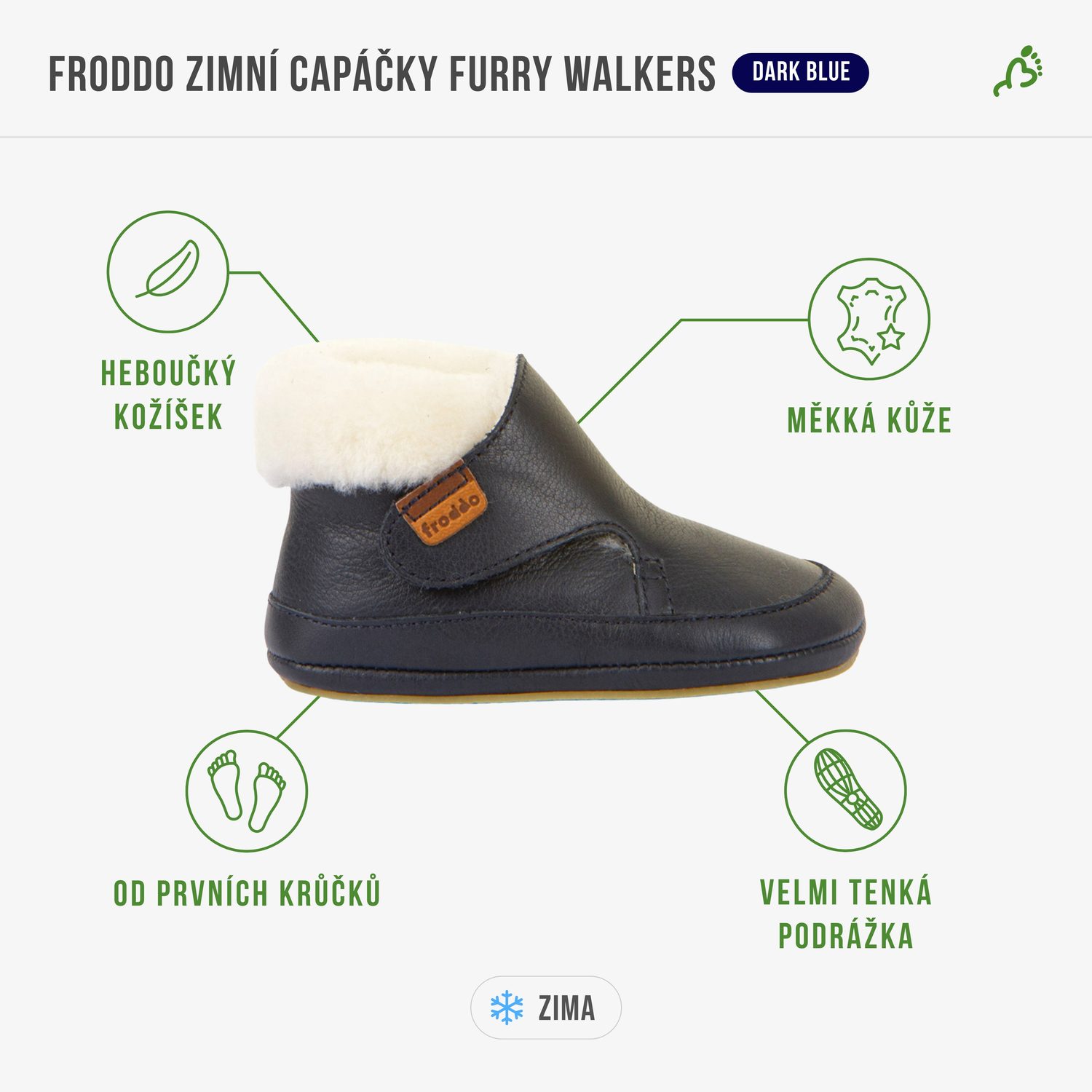 Froddo Furry Walkers jsou ideální volbou pro děti, které začínají chodit, i pro již zkušenější chodce. Jsou vhodné na středně široká a mírně širší chodidla a středně vysoký nárt. Široký pásek na suchý zip krásně utáhne botičku podle potřeby.