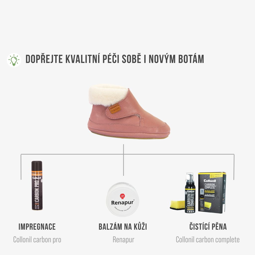 Mimořádně lehké a měkké zimní celokožené botičky pro nejmenší děti zateplené heboučkým vlněným kožíškem. Mají velmi tenkou podrážku a jsou vhodné jak pro první krůčky, tak i pro již zkušenější chodce. Nebudou nijak omezovat nohy vašich dětí a umožní jim ten nejpřirozenější vývoj.