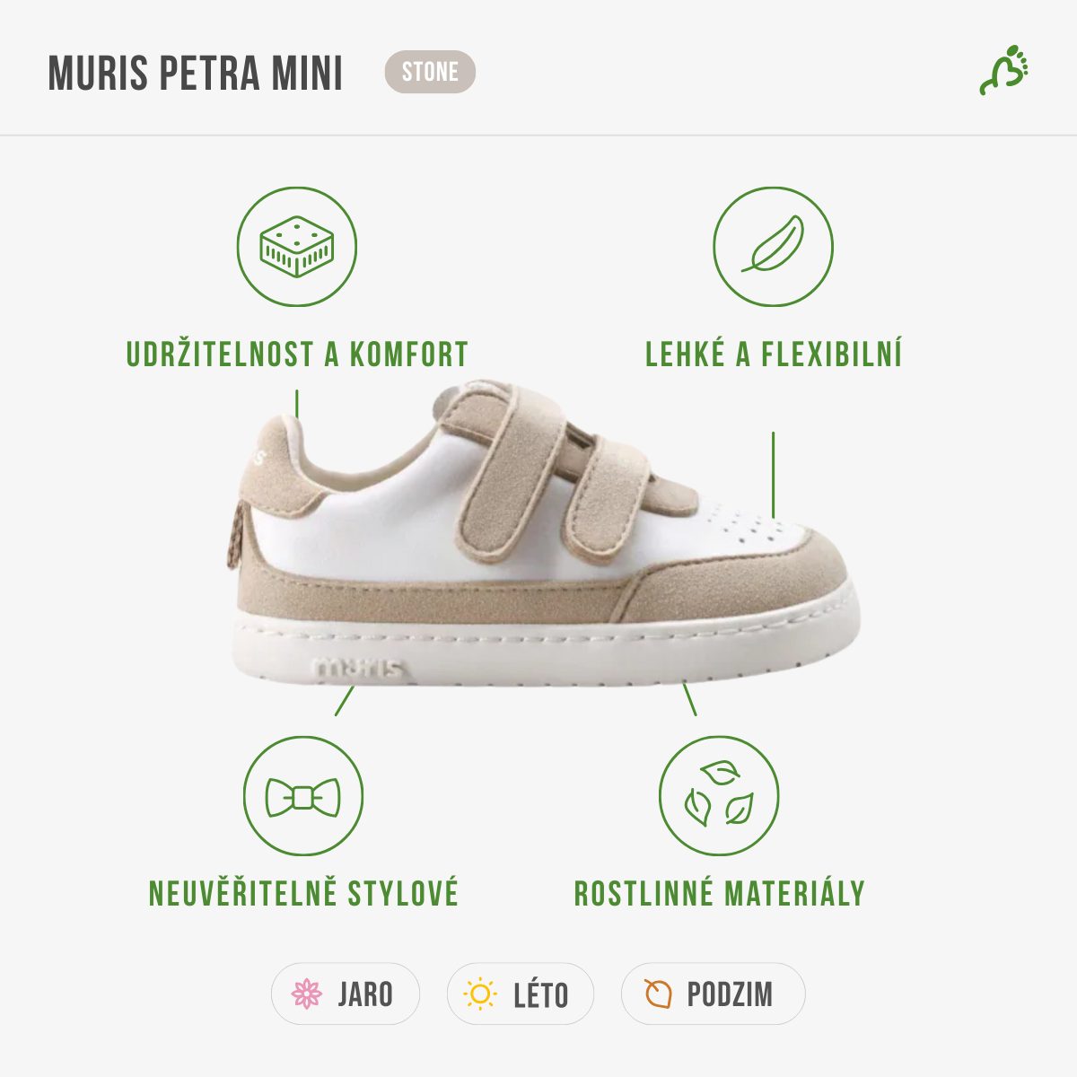 MURIS Petra – boty, které rostly ze země a míří s dětmi do světa. Petra je barefoot obuv, která spojuje udržitelnost s maximálním komfortem. Vyrobená z 80 % rostlinných materiálů – vnější část z hroznového odpadu, vnitřek z kukuřice – je lehká, prodyšná a šetrná k přírodě i k dětským nohám. Petra je lehká, flexibilní a připravená na každý krok – od hřiště až po lesní stezku.