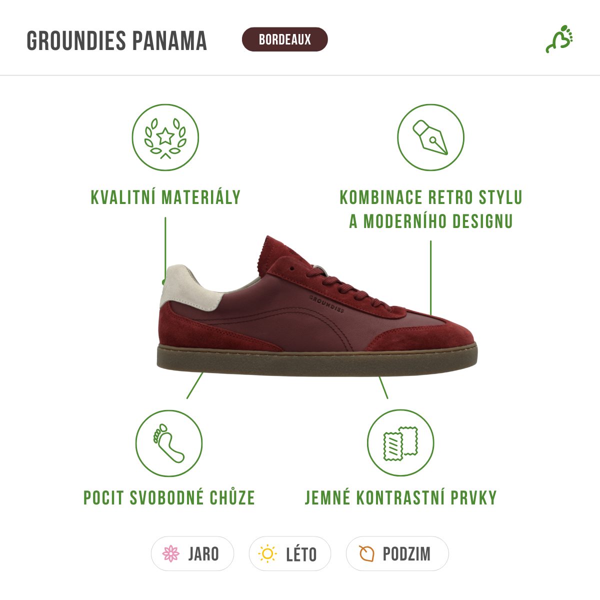 Jedinečná kombinace retra a moderního designu se neuvěřitelně povedla. Nový model GROUNDIES PANAMA přináší svěží vánek do světa barefoot tenisek. Jemné detaily hladké kůže a semiše dotahují neotřelý vzhled. Osvědčená podšívka OnSteam® je zárukou cirkulace vzduchu a podrážka TrueSense® vám umožní pocit svobodné chůze a maximální kontakt se zemí. Krásná bota a ta nejlepší investice do vašeho zdraví, co víc si přát?