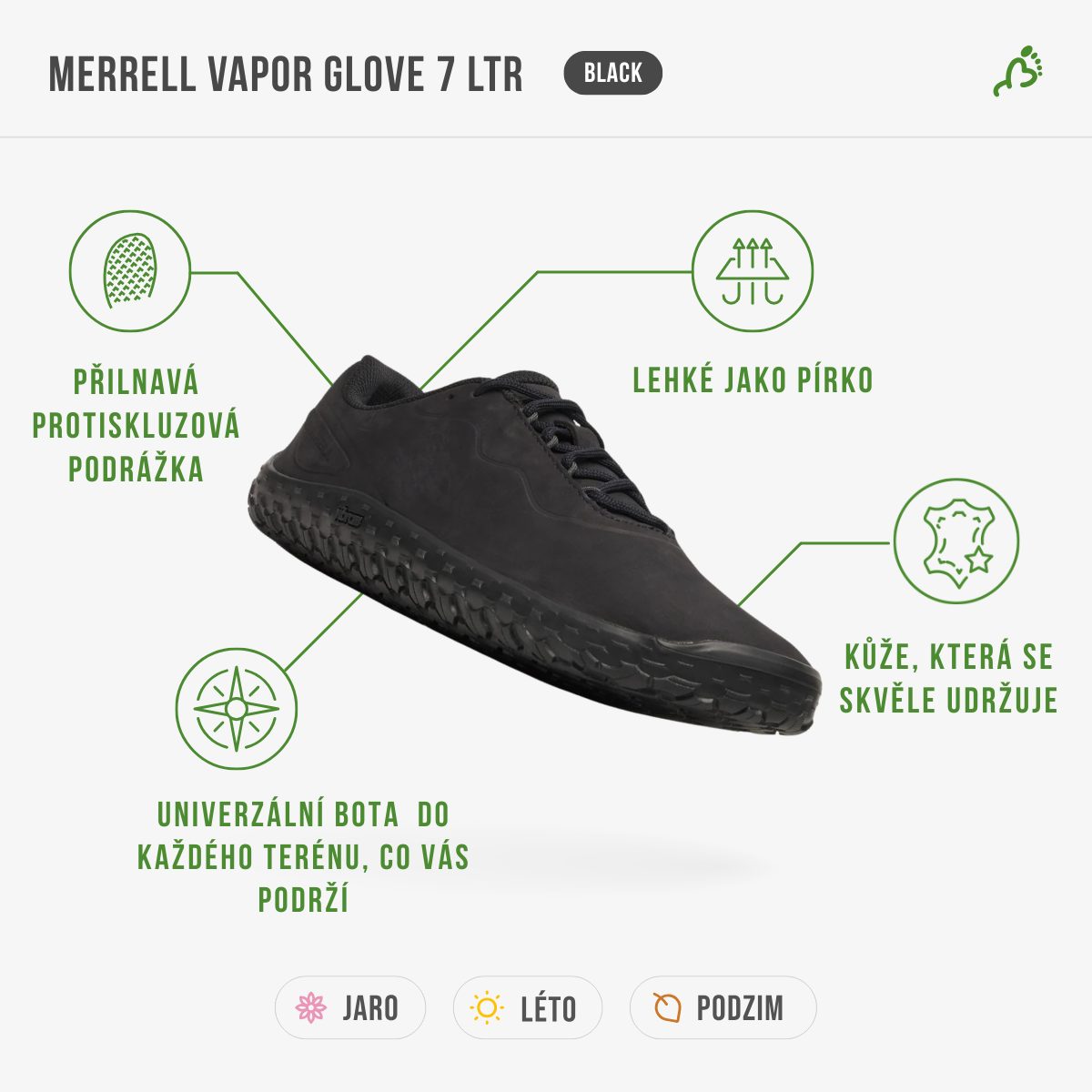 Merrell Vapor Glove LTR 7 jsou barefoot boty pro každého, kdo chce přirozený pohyb bez kompromisů, ale zároveň hledá model s elegantnějším vzhledem. Kožený svršek působí čistě a nadčasově, takže se snadno kombinuje s běžným oblečením a nepůsobí vyloženě sportovně. Je to typ bot, které si vezmete ráno a necháte na nohou celý den – protože vypadají dobře a zároveň dávají chodidlům volnost.