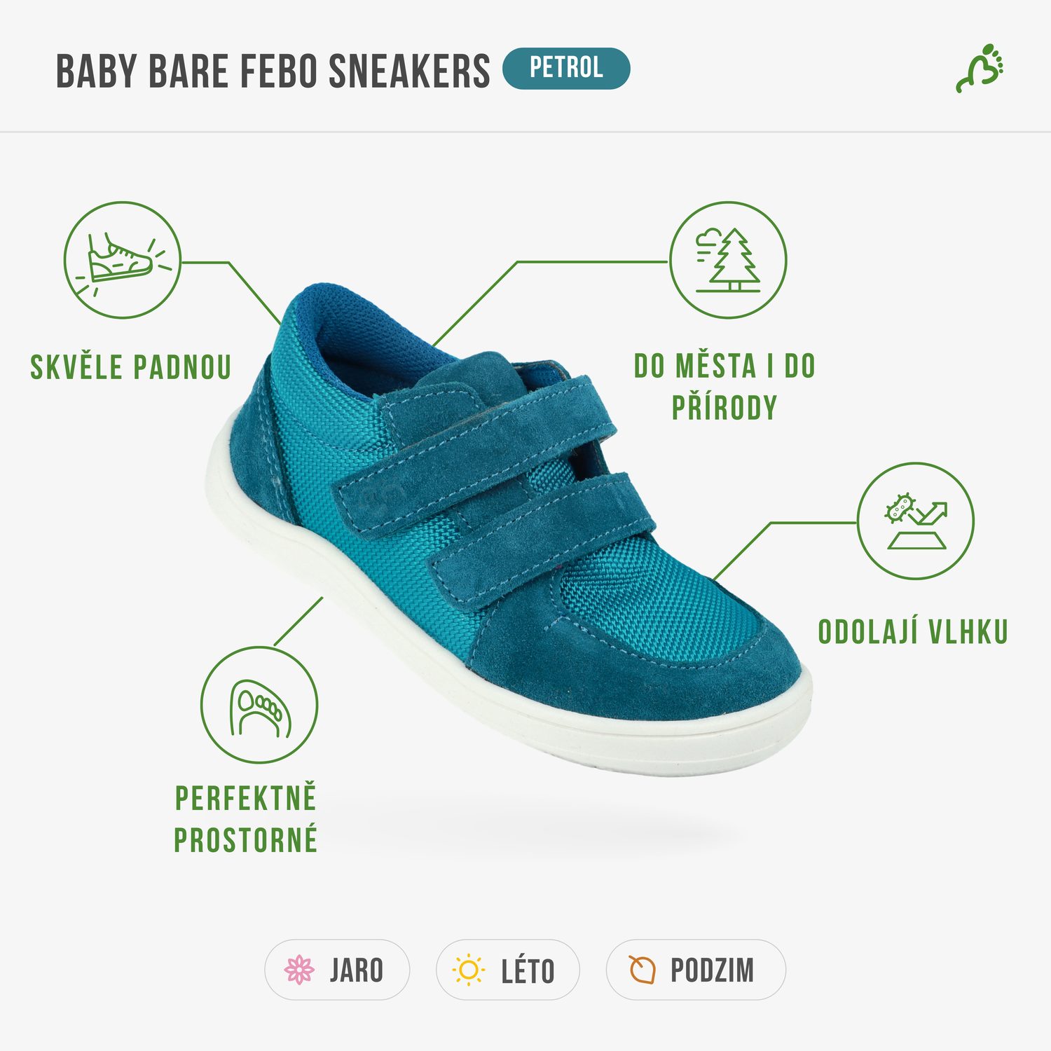 Febo Sneakers jsou vhodné pro začínající i zkušené chodce, kteří už stabilně chodí. Ideální pro děti s normálním až širším chodidlem, i s dominantním palcem díky anatomicky tvarované špičce.