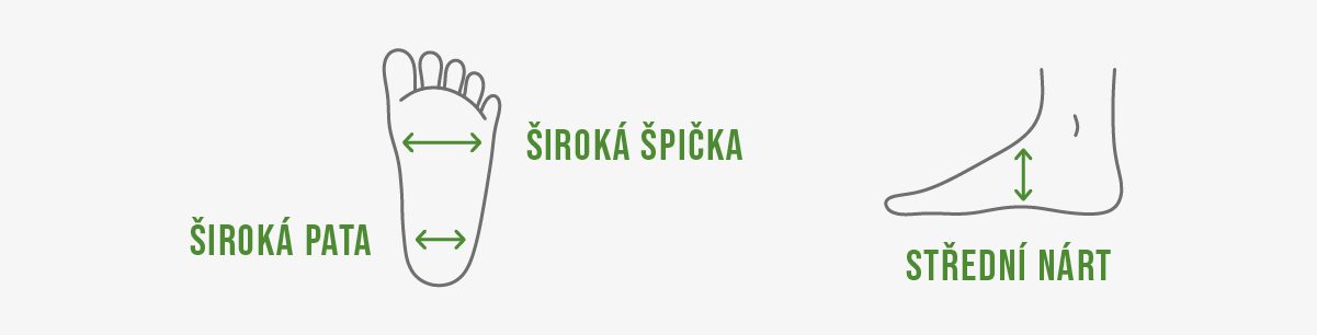 | Šíře chodidla | Střední, Středně širší, Široké |