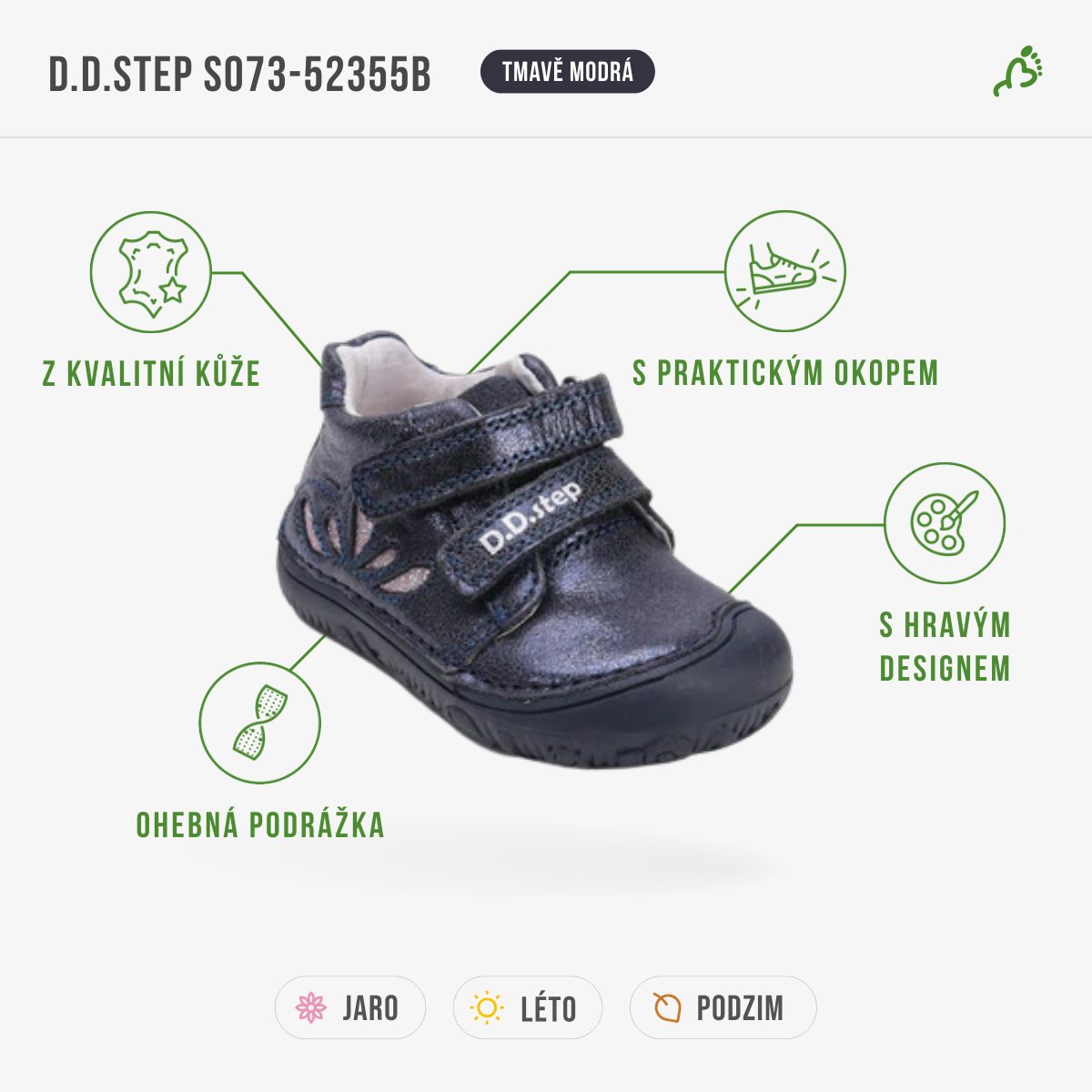 Kožené celoroční barefoot botičky od oblíbené značky D.D.step jsou pro děti zábavné svým originálním vzhledem s hravými detaily. Díky jejich speciální technologii a způsobu šití potěší skvělou odolností a dětskou nožku podpoří ve správném růstu a přirozeném vývoji.