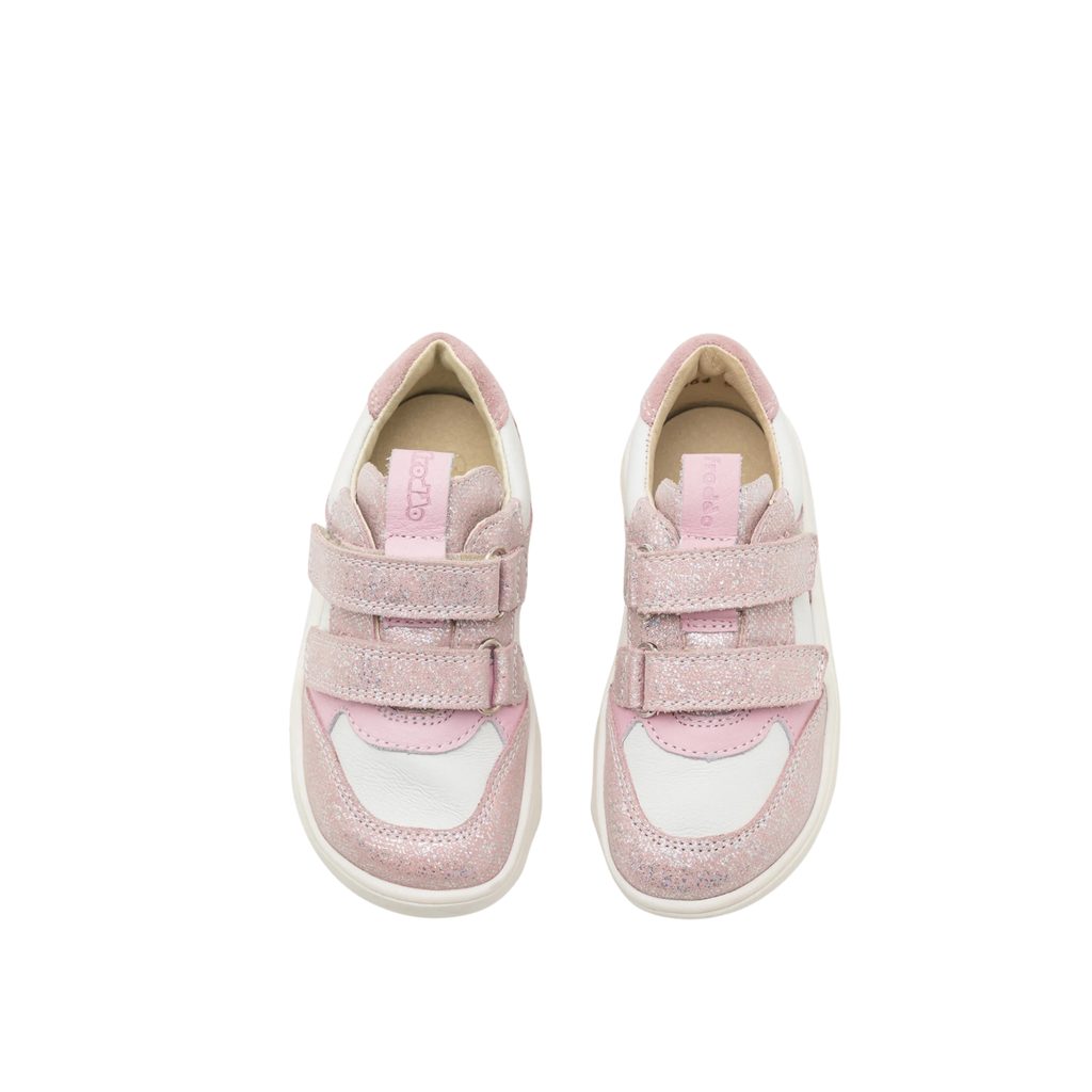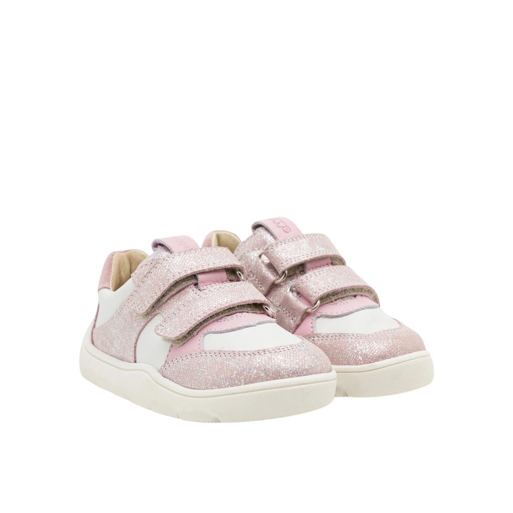 Dětské barefoot tenisky z kvalitní kůže s elegantními třpytivými prvky. Mají snadné zapínání na suchý zip a extra flexibilní podrážku pro přirozený pohyb a pohodlí. Širší špička zajišťuje stabilitu při chůzi a svobodu pro prsty. Gumový okop chrání nejen prsty, ale i boty před poškozením.