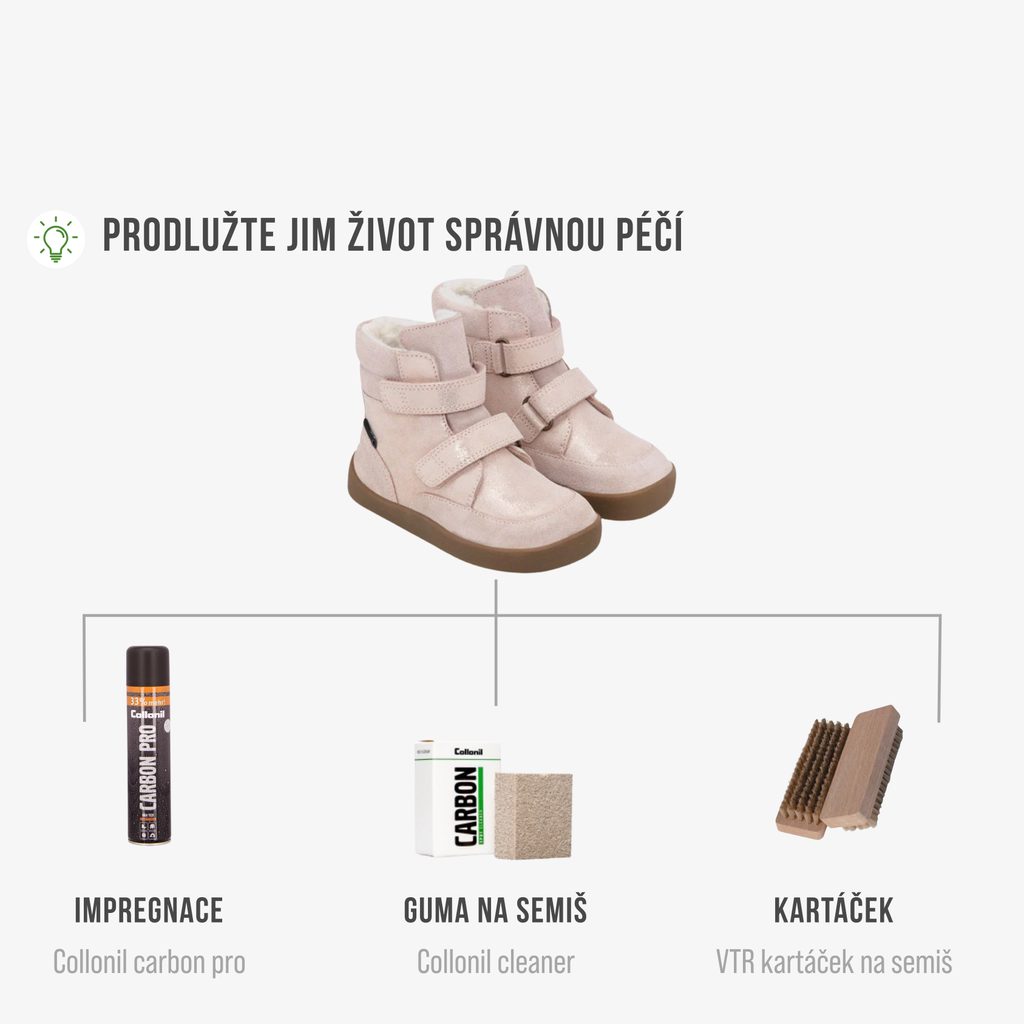Basil je klasická zimní obuv z měkkého semiše, navržená pro děti, které ocení větší prostor v oblasti prstů. Díky pohodlnému a širokému střihu sedí i dětem s dominantním palcem nebo širším chodidlem. Oblíbená volba pro mladší i starší děti, které potřebují teplou a funkční botu do zimních měsíců.