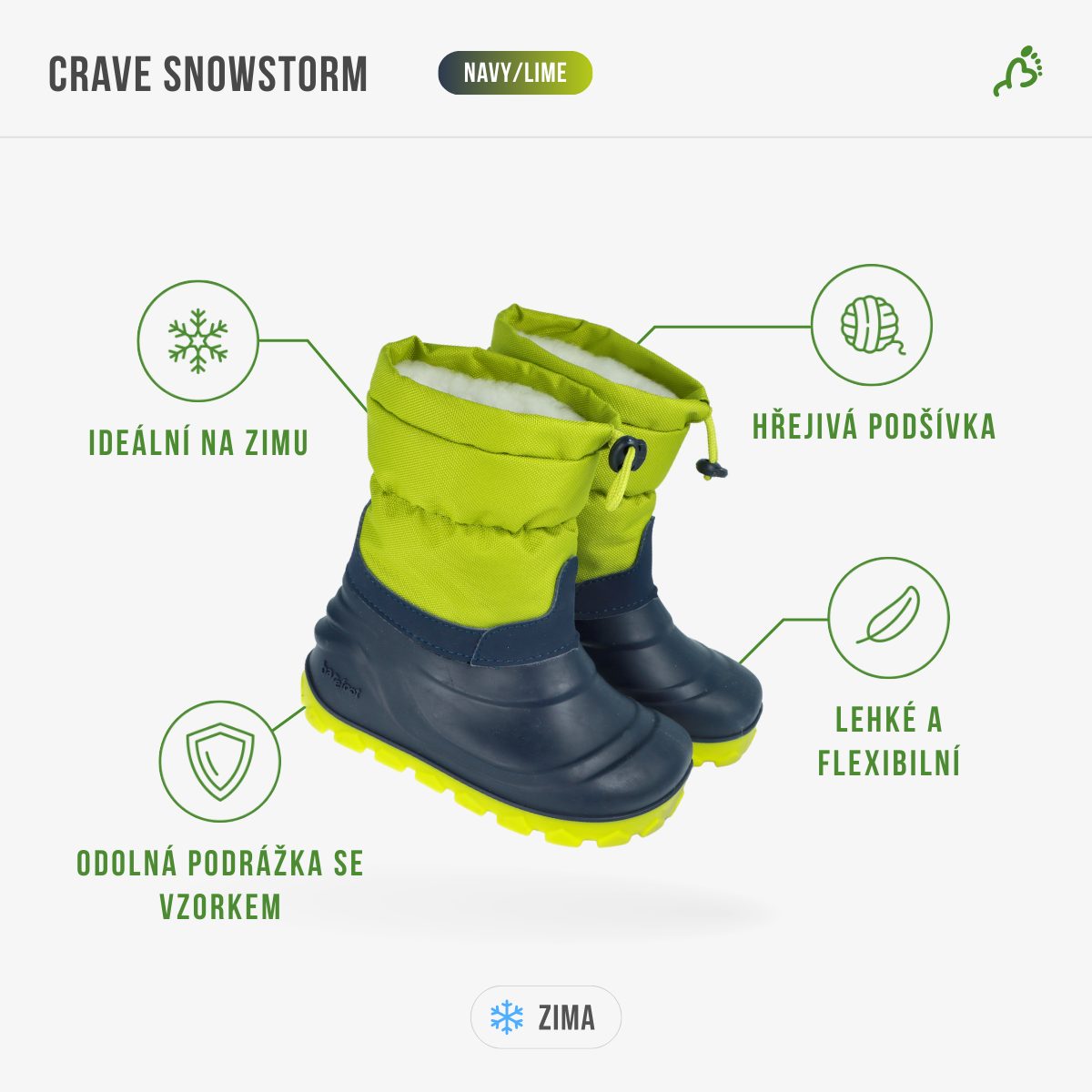 CRAVE Snowstorm jsou dětské barefoot sněhule navržené pro opravdové zimní dobrodružství. Odolný nylonový svršek, hřejivá podšívka s měkkým zateplením a napevno vložená dvouvrstvá plstěná stélka zajistí spolehlivou ochranu před chladem i vlhkostí, a to i při dlouhých hodinách venku.