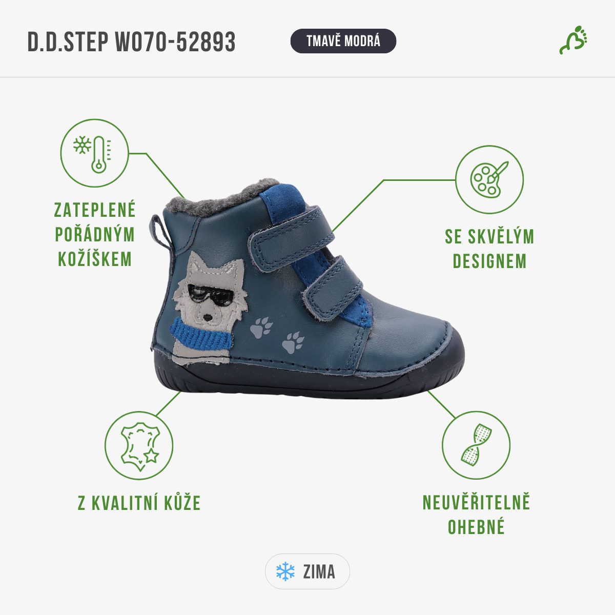 Oblíbené zimní barefoot boty D.D. Step jsou ideální volbou pro každodenní nošení během podzimu a zimy. Díky hřejivému kožíšku udrží dětské nohy v teple, zatímco flexibilní podrážka, prostorná špička a nulový drop podporují zdravý vývoj chodidla a přirozený styl chůze.
