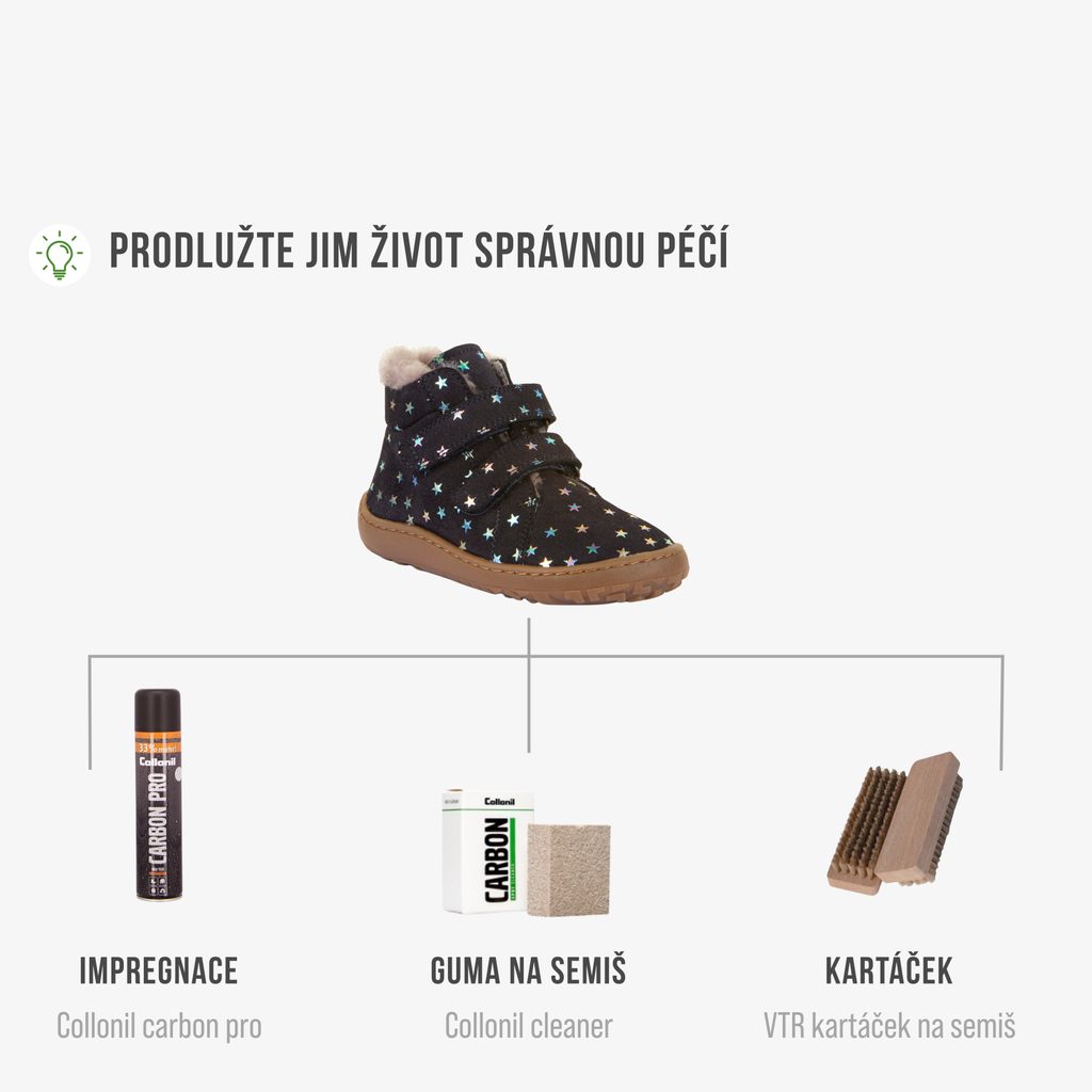 Tyto zimní boty jsou ušité z velmi kvalitní broušené kůže s vodoodpudivou úpravou. Uvnitř mají příjemně hřejivý kožíšek z ovčí vlny. který udrží nožky vašich dětí pěkně v teple. Tento model je navíc posetý třpytivými hvězdičkami.
