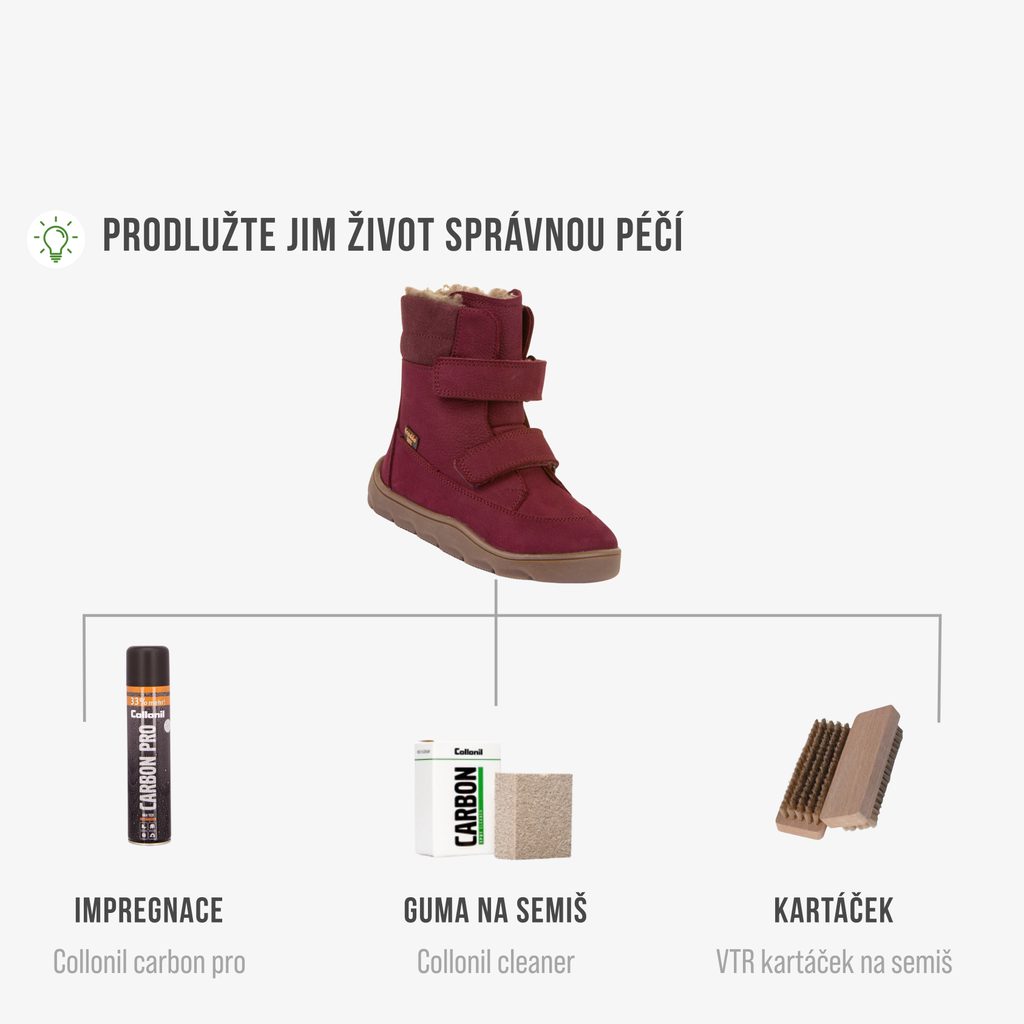 Boty doporučujeme očistit kartáčkem, případně pak ještě vlhkým hadříkem a nechat volně oschnout. Broušenou kůži můžete snadno vyčistit pomocí speciální gumy. Pro zvýšení odolnosti boty pravidelně ošetřujte impregnačním sprejem.