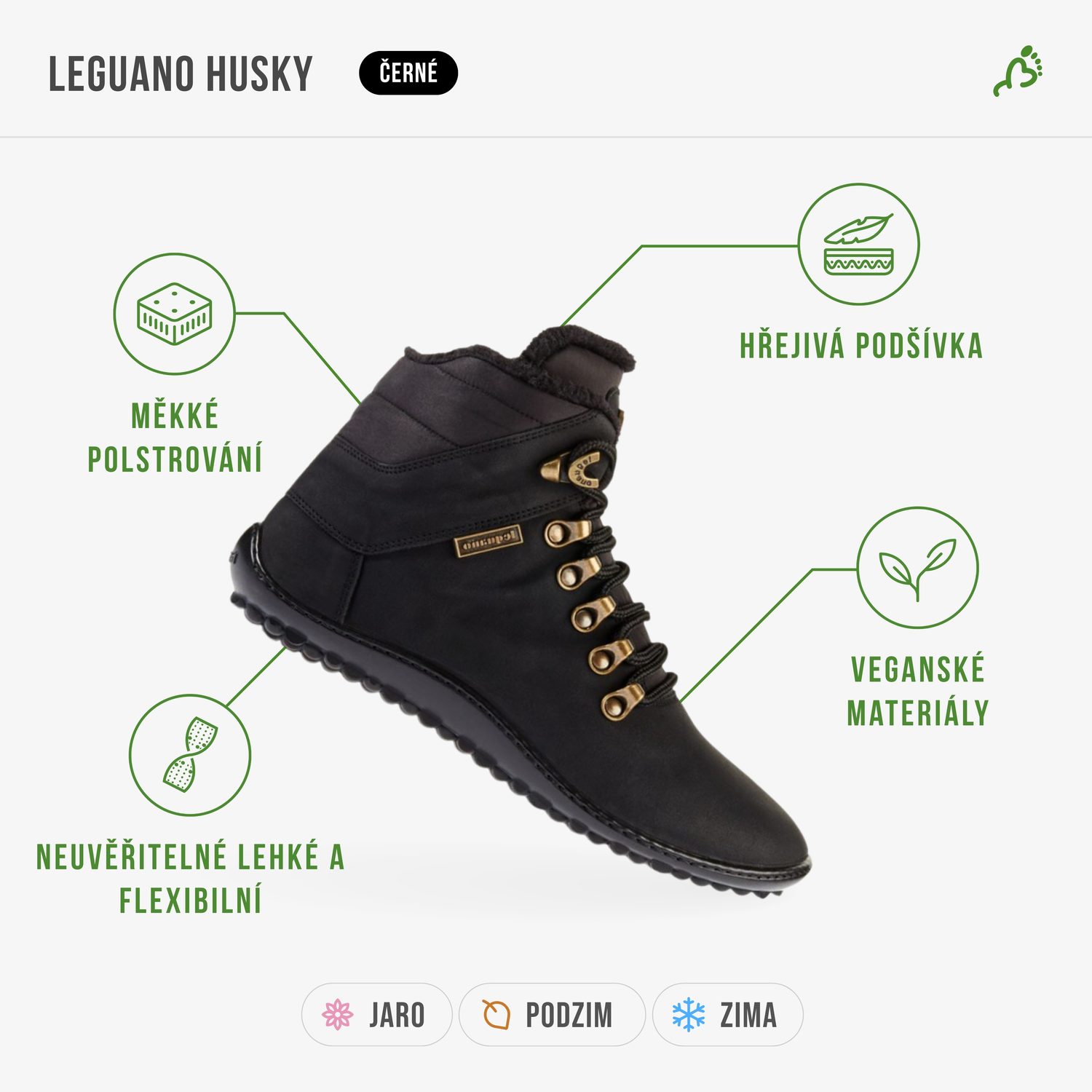 „Na zimní procházky vybírám z botníku mé oblíbené černočerné LEGUANO Husky. Hodí se ke všem kalhotám i do města, ale nejlíp se v nich cítím v přírodě. I v chladnu si skrze podrážku užívám pocit bosochození, a přitom mi je krásně teplo. Sáhnu po nich i při zimním kolo-výjezdu. I když fičí a třeba i poprchává, s husky na nohou je to v klidu. Jsou měkké v ohybu, dobře přilnou na pedály a úplně nejvíc oceňuji teploučko okolo kotníků!"