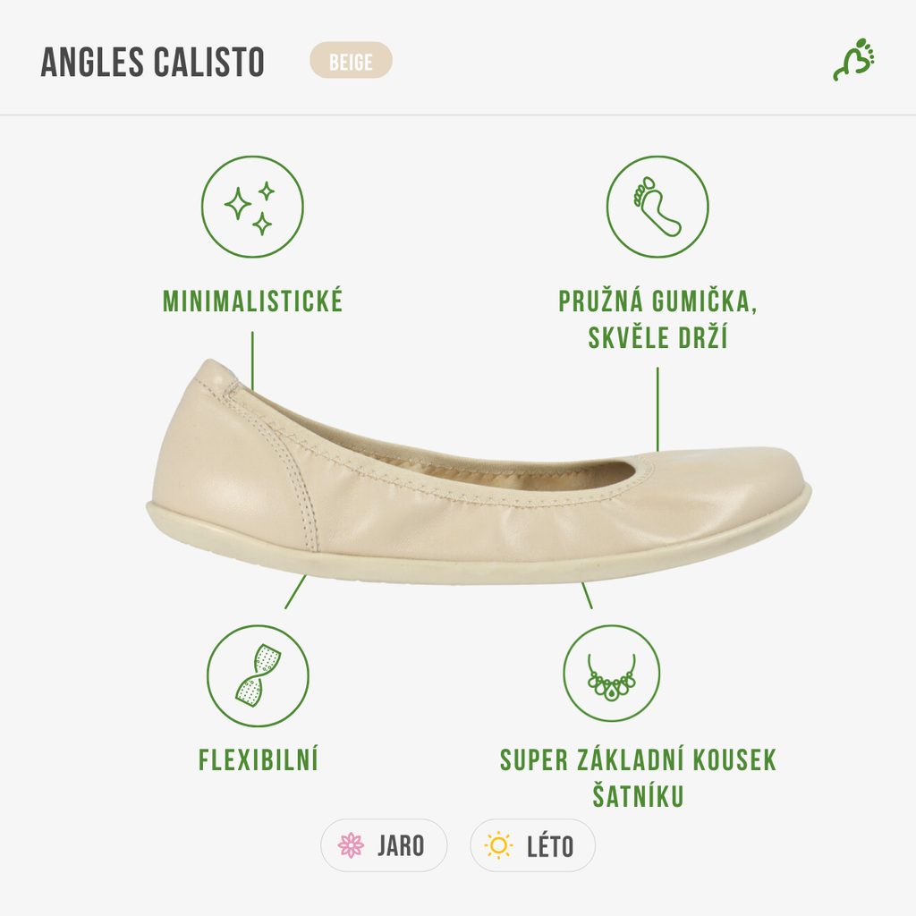ANGLES Calisto jsou elegantní barefoot baleríny, které spojují ženský styl s maximálním pohodlím. Na první pohled zaujmou čistým designem a jednoduchostí, při nošení pak překvapí lehkostí a přirozeným pocitem při každém kroku.