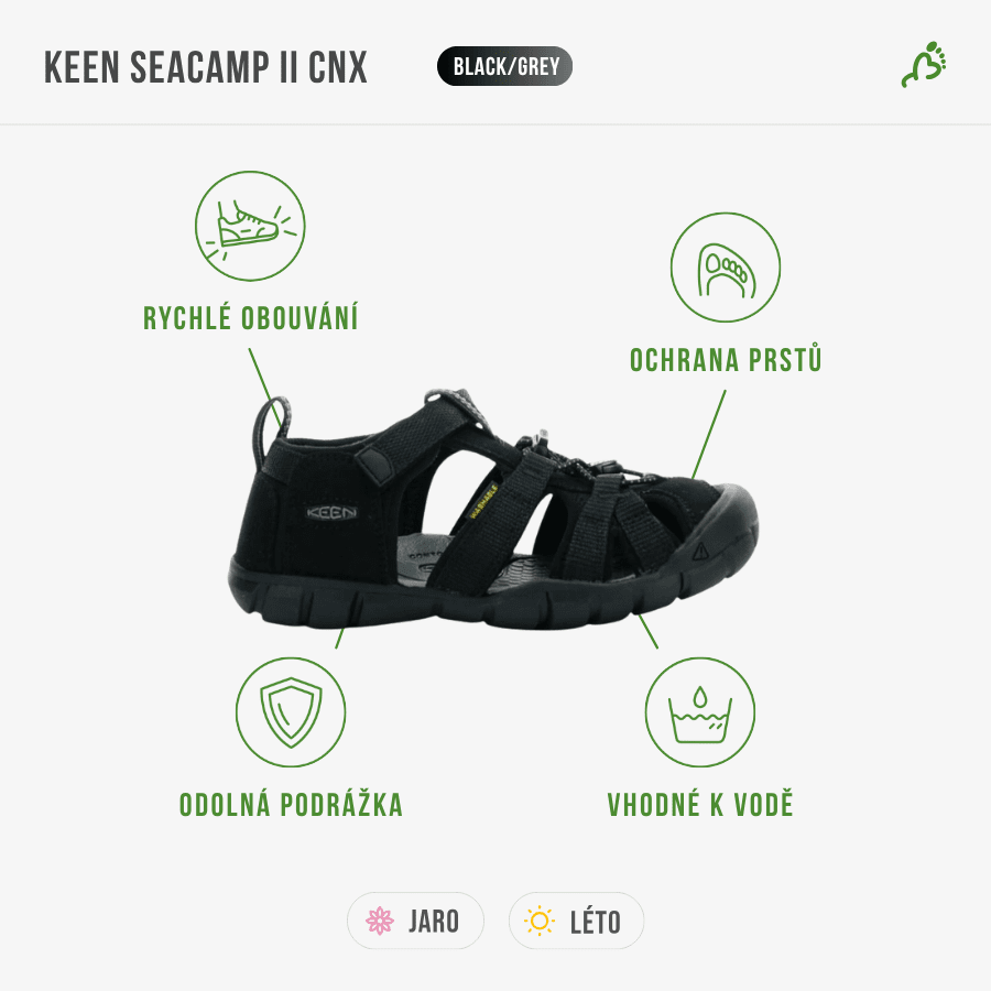 KEEN Seacamp II CNX Children jsou lehké sportovní sandály, které zvládnou každé dětské dobrodružství – od hřiště až po vodní radovánky. Kombinují odolnost, ochranu a pohodlí v jednom a díky rychlému zapínání padnou na nohu během pár vteřin.