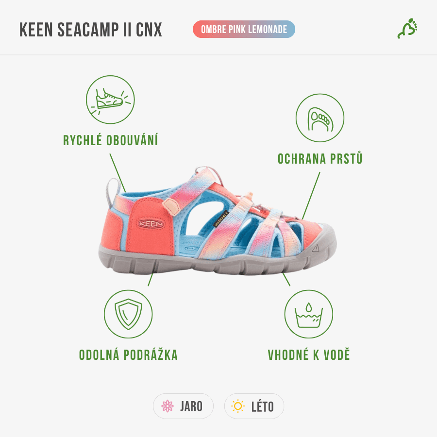 KEEN Seacamp II CNX Children jsou lehké sportovní sandály, které zvládnou každé dětské dobrodružství – od hřiště až po vodní radovánky. Kombinují odolnost, ochranu a pohodlí v jednom a díky rychlému zapínání padnou na nohu během pár vteřin.